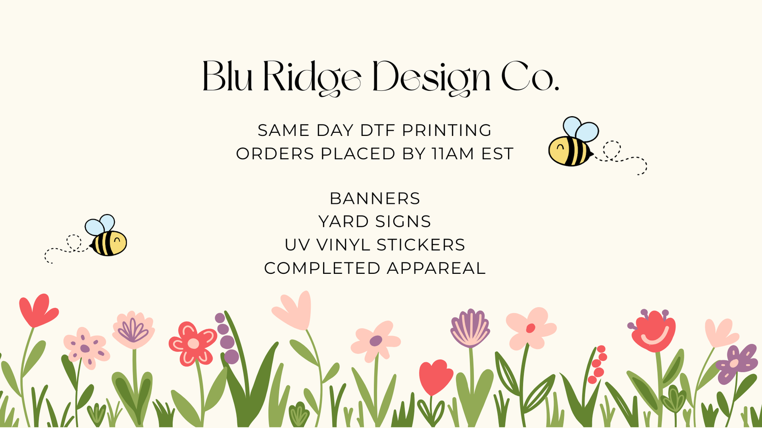 At Blu Ridge Design Co., we’re passionate about helping you create, customize, and stand out. As a veteran-owned business, we specialize in trendy, high-quality DTF transfers (singles and gang sheets), vinyl die-cut stickers, custom yard signs, banners, vehicle decals, and laser-engraved products.