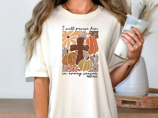 I will Praise Him in Every Season Psalm 146:2 Cross Fall Pumpkins Direct To Film (DTF) Transfer