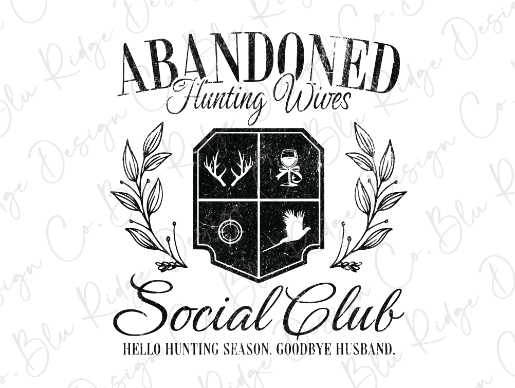 The Abandoned Hunting Wives Social Club Tee features a bold vintage-style crest with antlers, wine, and woodland flair, framed by elegant laurels and the tongue-in-cheek slogan: “Hello hunting season, goodbye husband.” Whether you’re at camp, tailgating, or surviving solo weekends — this one’s your badge of honor.