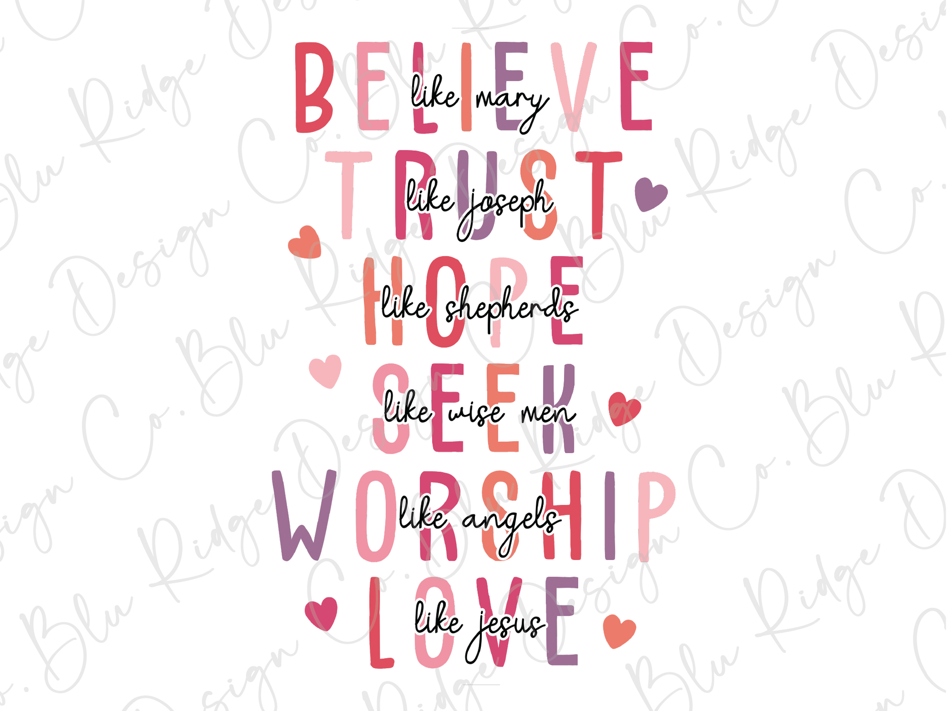 This inspirational graphic design features meaningful words of encouragement—Believe, Trust, Hope, Seek, Worship, Love—each paired with a powerful biblical reference to Mary, Joseph, the shepherds, the wise men, the angels, and Jesus. Soft colors and heart accents give the design a gentle, uplifting feel that speaks straight to the heart. Perfect for everyday wear, church gatherings, or gifting to someone who loves faith-based encouragement, this design shares a message of devotion, humility, and Christ-centered love.