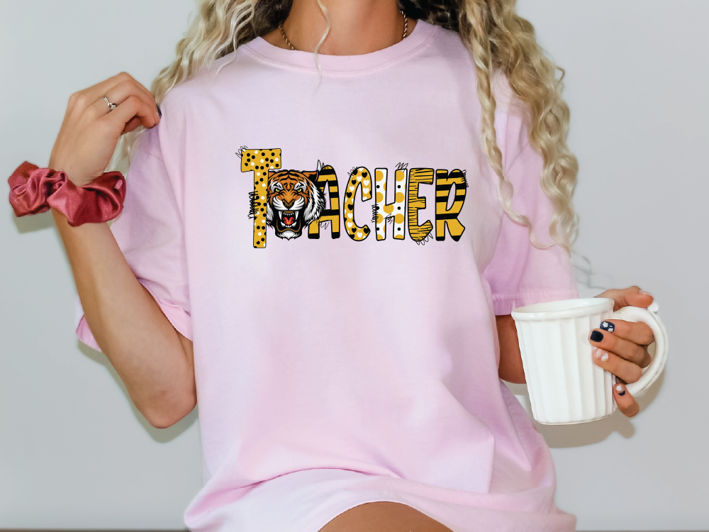 This bold design spells out TEACHER with fun animal print patterns and a fierce tiger face front and center, making it the perfect mix of stylish and school-spirited. Crafted on a soft, breathable tee, it’s comfortable enough for all-day wear and eye-catching enough to stand out at school events, spirit days, or casual Fridays. Whether you’re cheering on your team or just showing pride in your profession, this graphic tee is a must-have for educators who roar with passion!