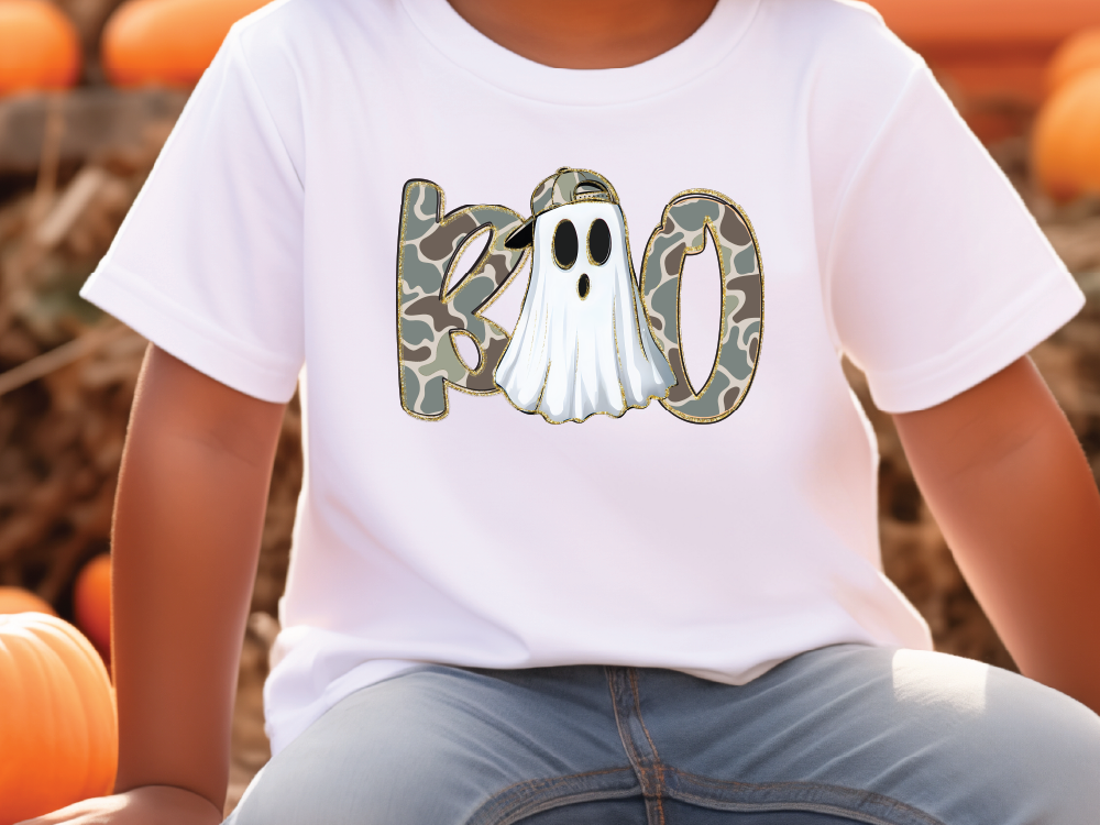 Spooky and stylish, this Camo Ghost "Boo" Kids Tee is the perfect shirt for your little one this Halloween season!