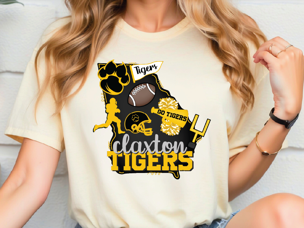 Featuring a detailed Georgia state outline packed with football icons, cheer pom-poms, and bold “Claxton Tigers” lettering in classic black and gold, this shirt is a must-have for players, parents, and fans. Whether you’re in the stands, on the sidelines, or cheering from home, this tee is designed to keep your spirit front and center. Made from soft, breathable cotton for comfort, it’s the perfect mix of style and team pride.