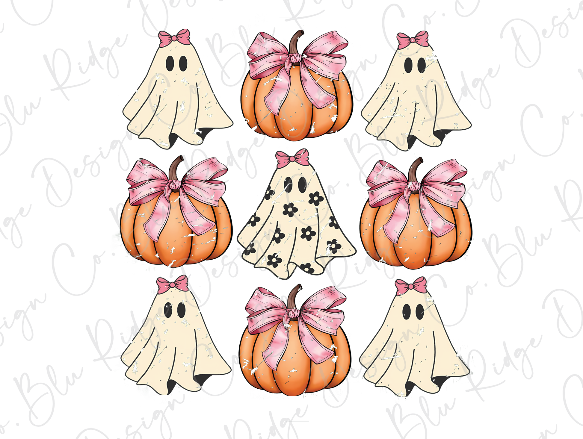 Featuring a playful mix of mini ghosts and pumpkins, each topped with charming bows, this design combines spooky fun with girly flair. The pastel pink accents and leopard print details make it a stylish twist on traditional Halloween outfits.