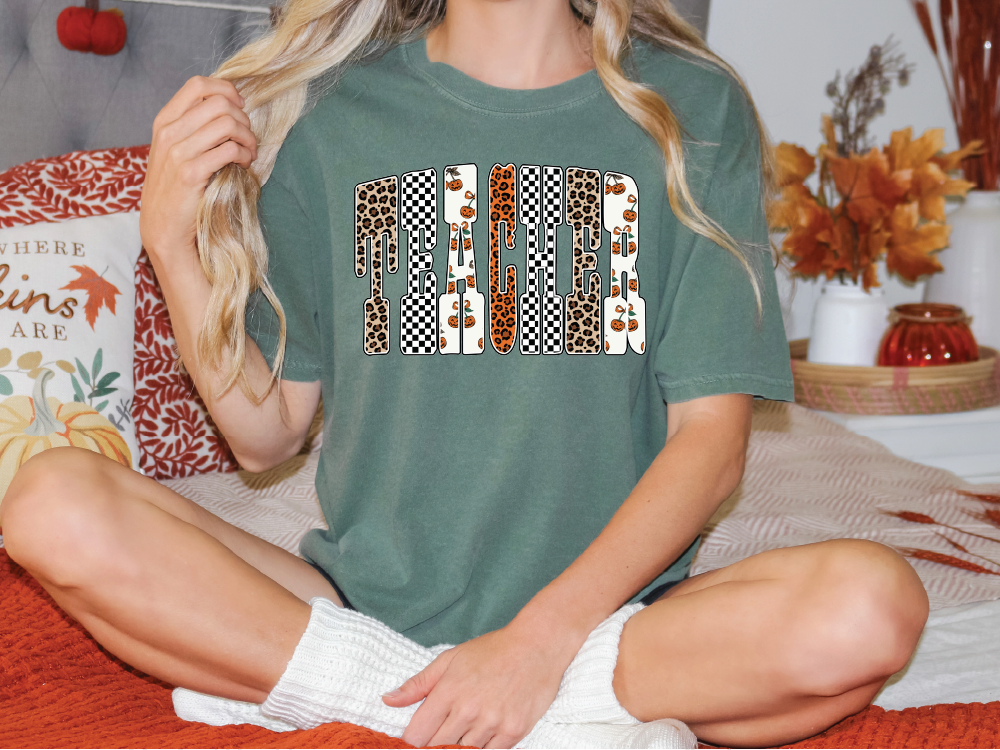 Featuring bold patterned letters filled with pumpkins, leopard, and classic fall checks, this tee is both fun and fashionable. Designed with cozy comfort in mind, it’s ideal for layering on cool autumn mornings or wearing solo during busy school days. Whether you’re teaching, cheering at a fall festival, or enjoying a pumpkin spice latte, this shirt brings the perfect mix of seasonal charm and teacher pride.
