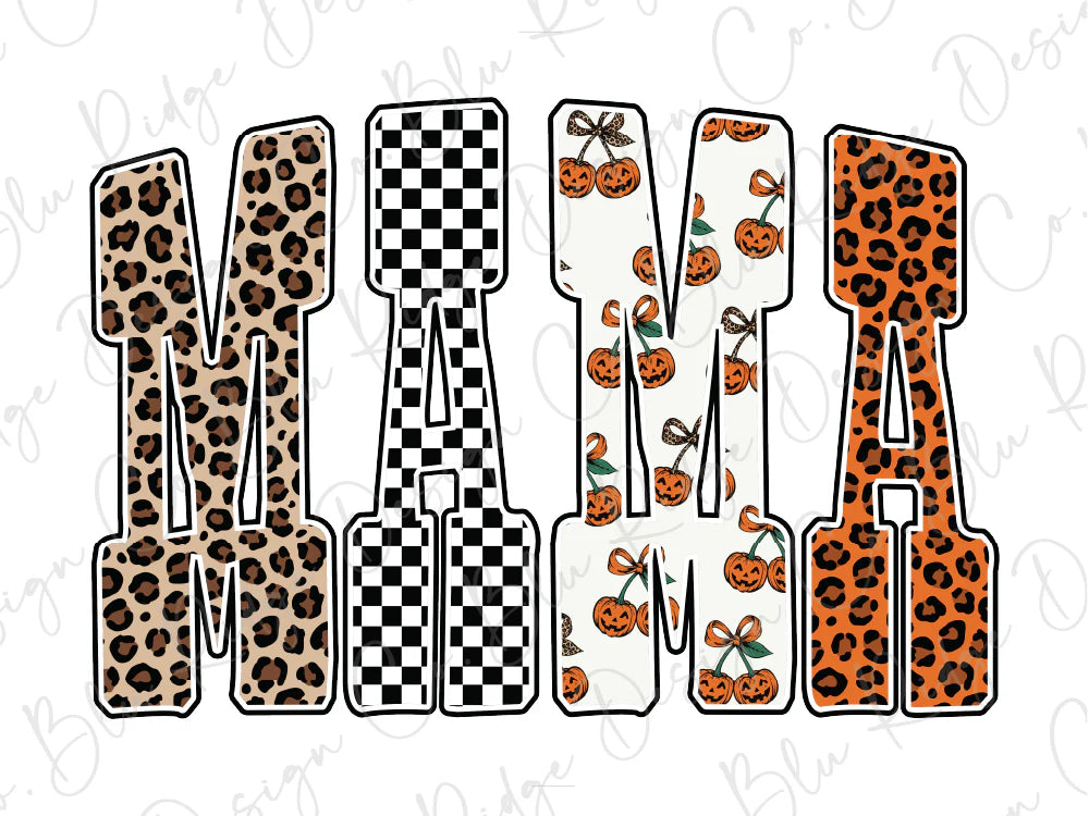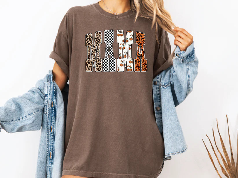 Featuring bold block letters filled with leopard print, checkerboard, and pumpkin patterns, this design is perfect for spooky season and beyond. The playful mix of textures and prints makes it a standout piece for fall, whether you’re at a Halloween party, cheering at a game, or just enjoying pumpkin spice everything. A must-have graphic tee for stylish mamas who love fun seasonal flair.
