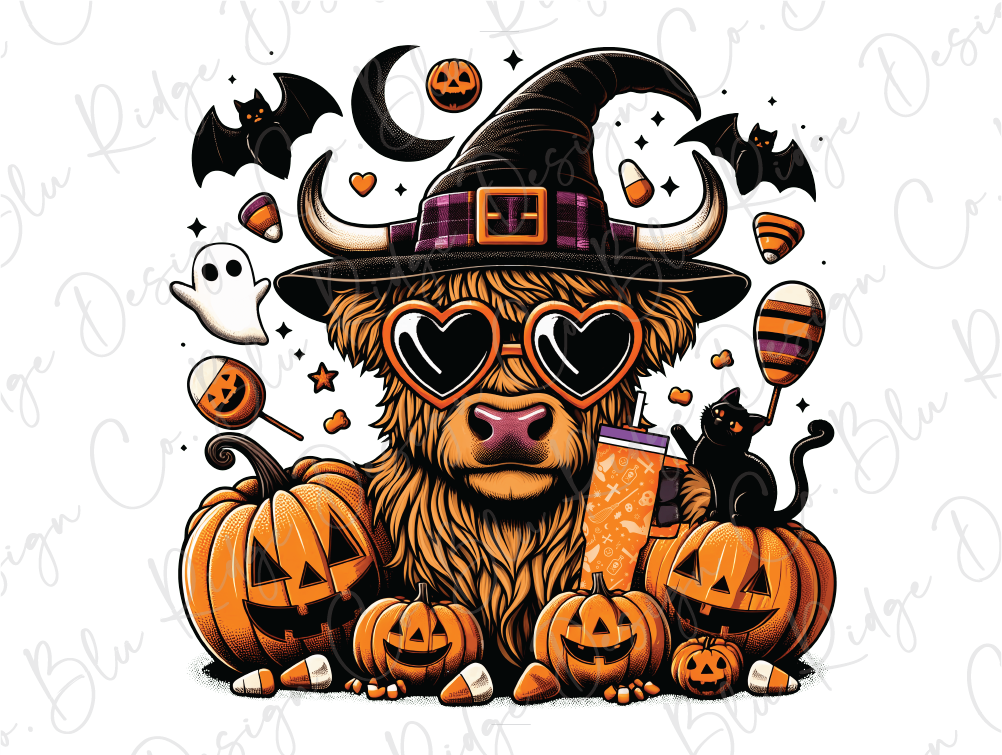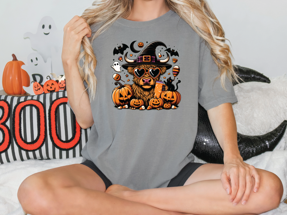 Bring some festive fun to your fall wardrobe with this Highland Cow Halloween Graphic Tee.