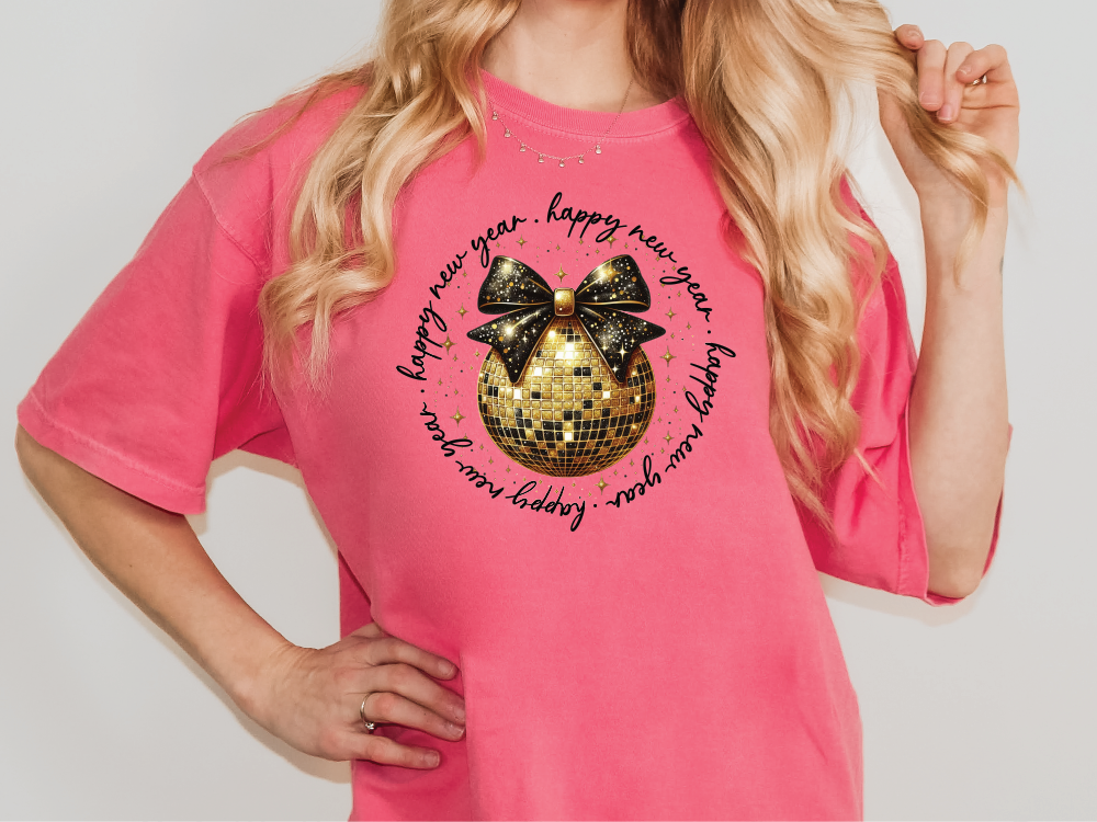 This gorgeous design features a shimmering gold disco ball wrapped in a glamorous bow and surrounded by a handwritten “happy new year” script for the perfect festive touch. It’s chic, celebratory, and made for anyone who loves a little glam as the clock strikes midnight. Soft, comfortable, and full of shine, this tee is perfect for New Year’s Eve parties, cozy celebrations at home, or adding a little sparkle to your everyday wardrobe. Start the year glowing! ✨🎉