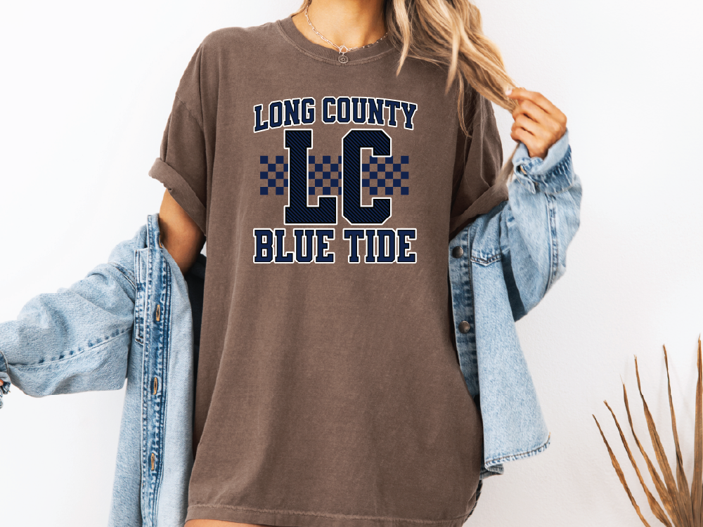 Featuring bold lettering and a checkered LC design in deep navy and white, this shirt is perfect for game days, spirit events, or everyday wear. The relaxed unisex fit makes it both comfortable and versatile—pair it with jeans, shorts, or layer it under a jacket for a casual look. A must-have for every Long County fan looking to rep the Tide in comfort and confidence!
