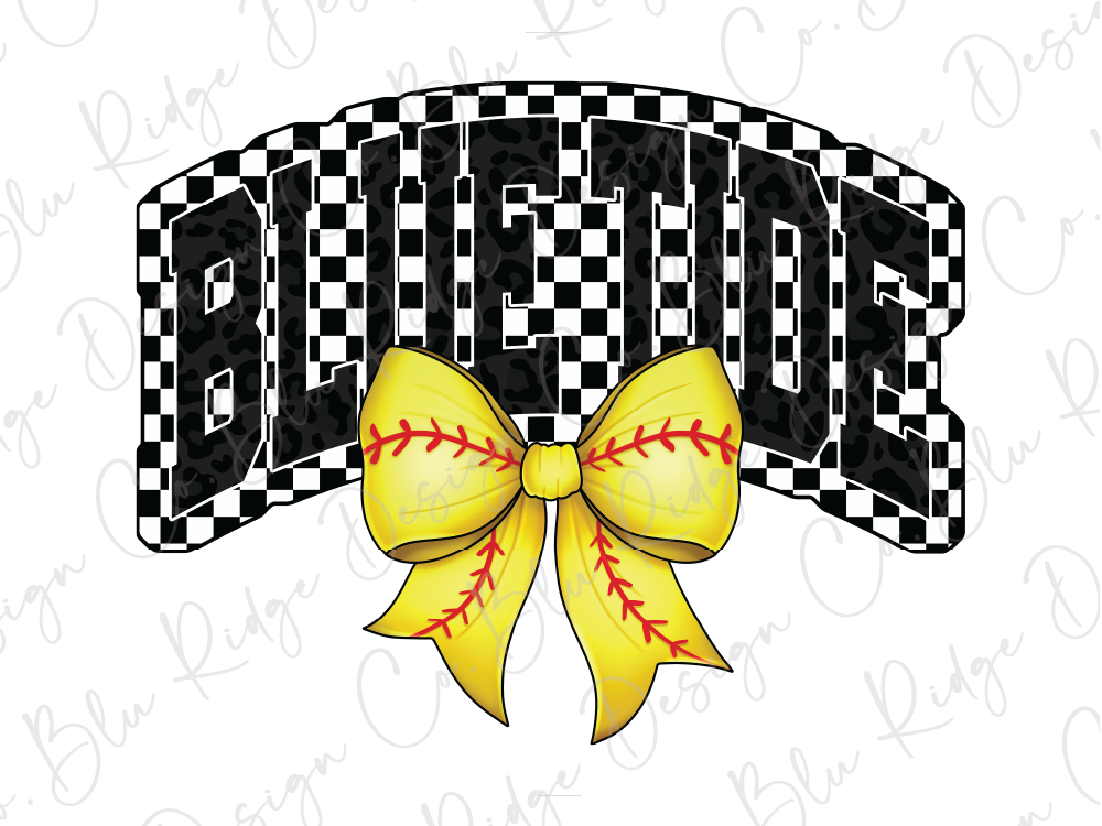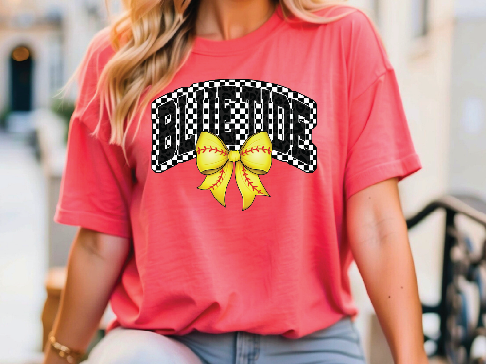 This Blue Tide graphic combines sporty attitude with a touch of flair—featuring a bold checkered and leopard print backdrop, varsity block letters, and a bright yellow bow detailed with red softball stitching. Perfect for players, fans, and proud softball moms who want to stand out at the game or around town.