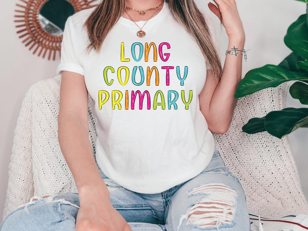 Featuring bold, rainbow block letters that spell out “Long County Primary,” this tee is perfect for students, parents, and supporters who want to rep their school in style. Designed for both comfort and durability, this graphic tee is soft, breathable, and easy to pair with jeans, shorts, or leggings. Whether you’re cheering at a game, running errands, or just relaxing, this tee keeps you looking spirited and feeling comfortable all day long.