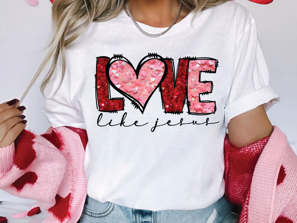 The “LOVE Like Jesus” design blends eye-catching texture with a powerful faith-based message that speaks louder than words. Featuring distressed lettering filled with layered heart details and paired with a handwritten script accent, this design delivers a modern Valentine aesthetic while keeping the focus on love, grace, and compassion. It’s perfect for spreading positivity, faith, and encouragement wherever you go.