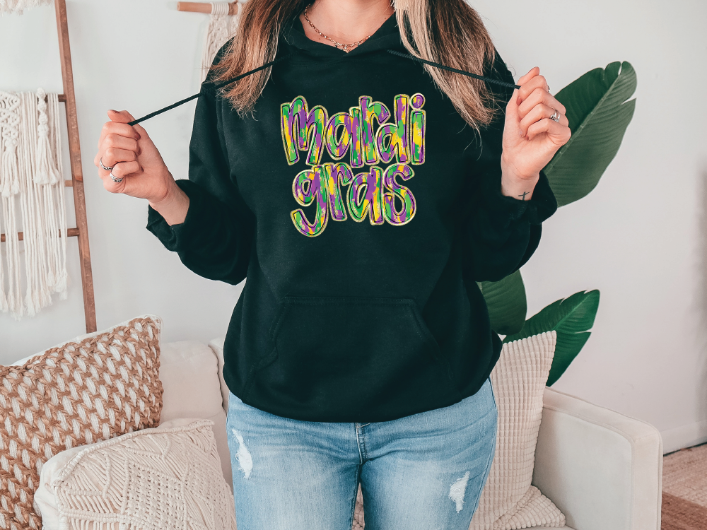 This Mardi Gras graphic design features playful, paint-stroke lettering filled with vibrant carnival colors, creating a fun, artistic twist on a timeless celebration. The layered, hand-painted look adds movement and personality, making this design stand out whether you’re celebrating at a parade or bringing Mardi Gras vibes to everyday wear. Perfect for anyone who loves bright colors, creative style, and festive flair, this design captures the joy, excitement, and spirit of Mardi Gras in a bold, eye-catching way.