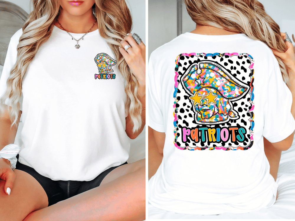 This standout design features a vibrant, splatter-painted patriot with star shades and playful PATRIOTS lettering, framed by a fun black-and-white spotted background. The large back print turns heads, while the smaller matching chest logo keeps the front clean and stylish. Perfect for game days, pep rallies, or everyday wear, this tee brings a pop of school pride to your wardrobe.