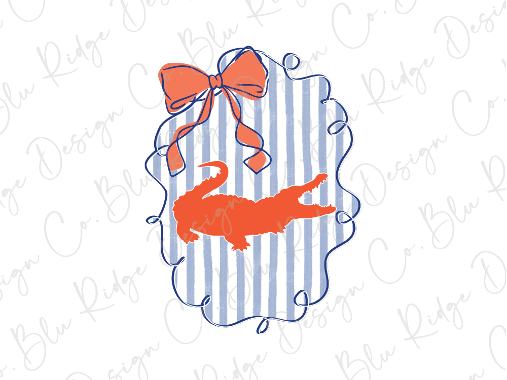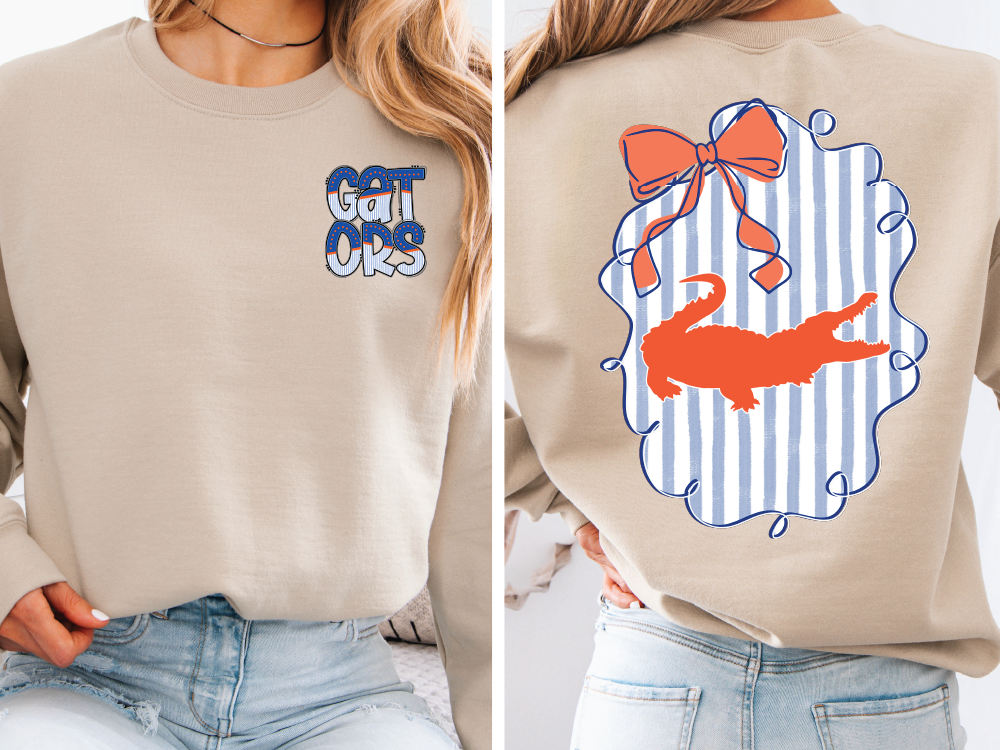 This Gators Coquette graphic tee features a bold retro "Gators" print on the front chest and a statement back design with an orange alligator silhouette, soft blue seersucker-inspired stripes, and a chic bow accent. The stylish tee makes it perfect for game days, tailgates, or casual everyday wear.