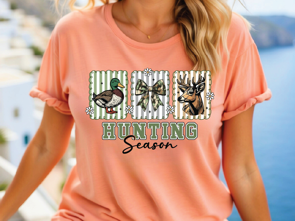 Featuring a preppy trio of designs — a mallard duck, camo bow, and majestic buck — framed in striped and floral patterns for a touch of southern charm. Whether you’re heading to camp, hanging with friends, or just celebrating your favorite time of year, this shirt is a must-have for every hunting-loving heart.