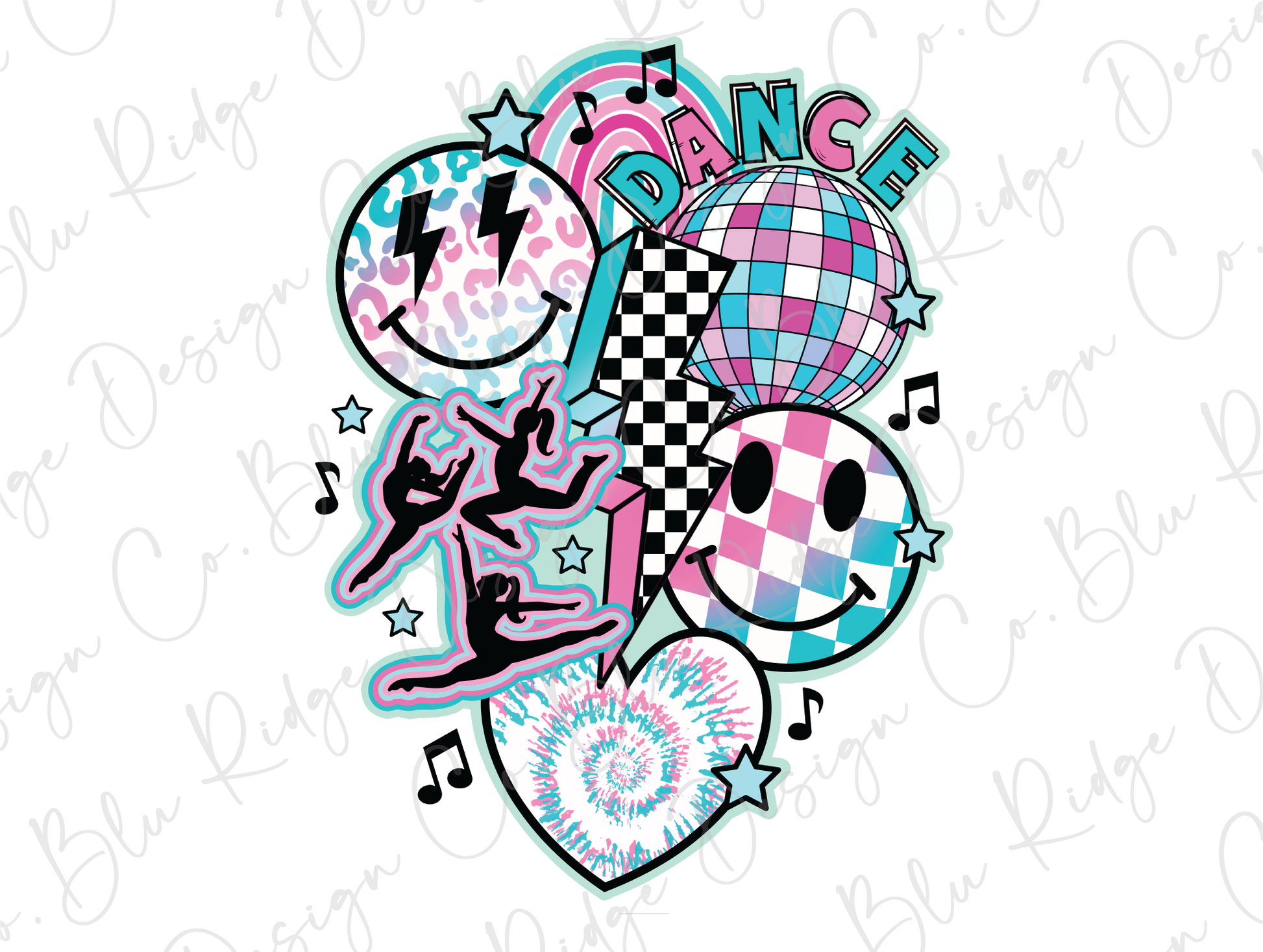 Packed with fun icons—including groovy smiley faces, a checkered disco ball heart, lightning bolts, musical notes, and dynamic dance silhouettes—this design brings bold color and energetic personality to every outfit. The teal, pink, and purple palette pops perfectly on the white tee, making it an instant favorite for dancers of all ages. It’s the perfect way for any dancer to express their love for dance with style!