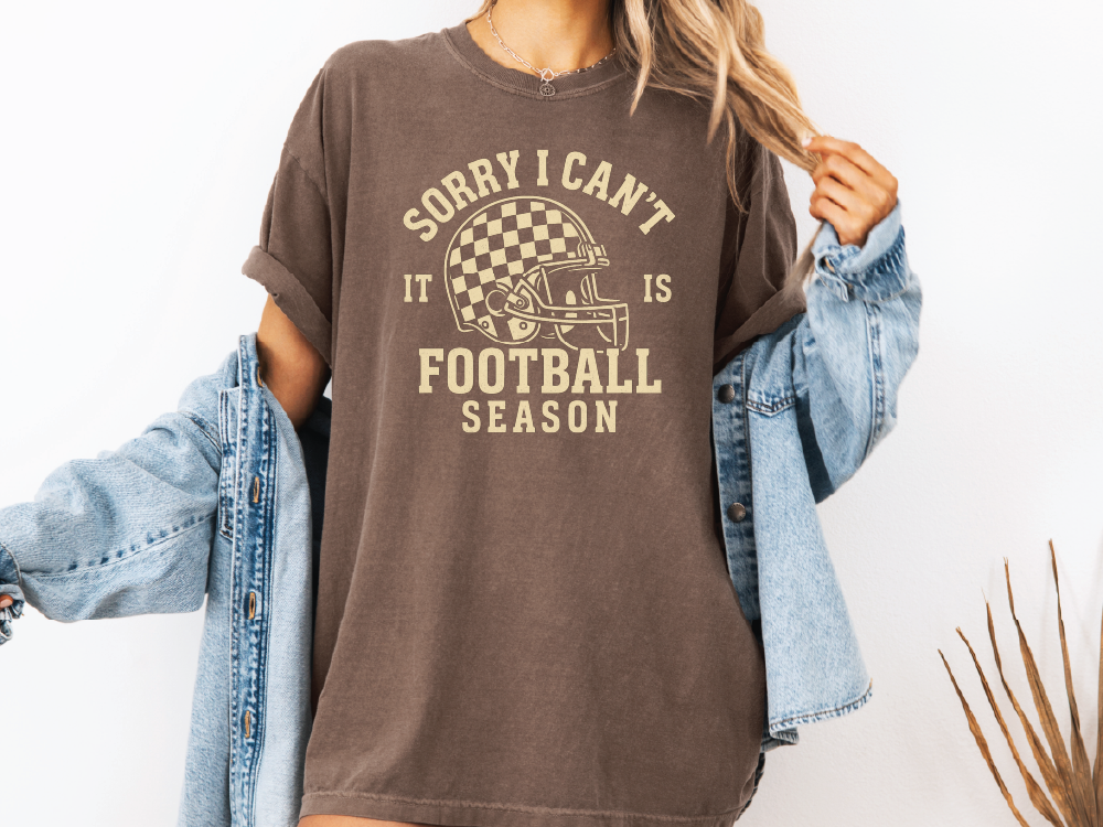 Show your love for the game in style with this vintage-inspired “Sorry I Can’t, It’s Football Season” graphic tee.