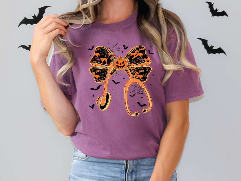 Celebrate spooky season in style with our Halloween Nurse Stethoscope Bow T-Shirt! 🎃🩺