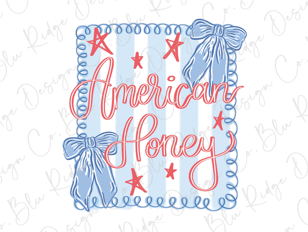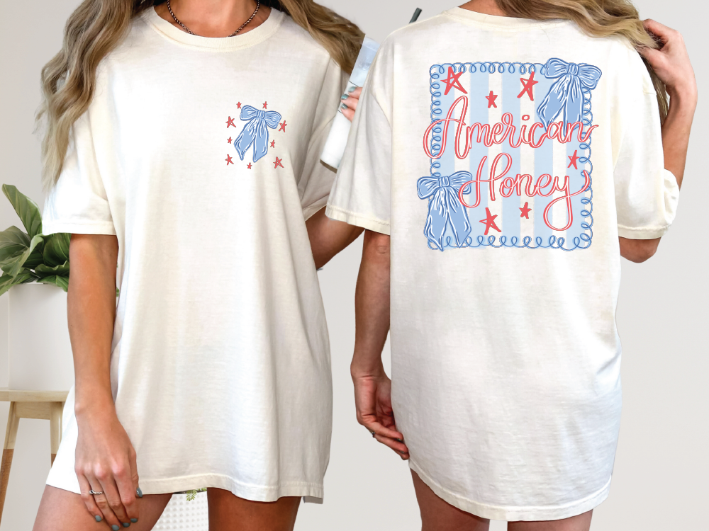 This American Honey tee features a beautiful hand-lettered back graphic framed with loopy stitching, soft blue bows, and scattered red stars. The front pocket area includes a matching bow and star cluster for that perfect boutique-style balance. It’s the ultimate blend of cute, casual, and country—ideal for 4th of July, country concerts, and warm-weather wear.