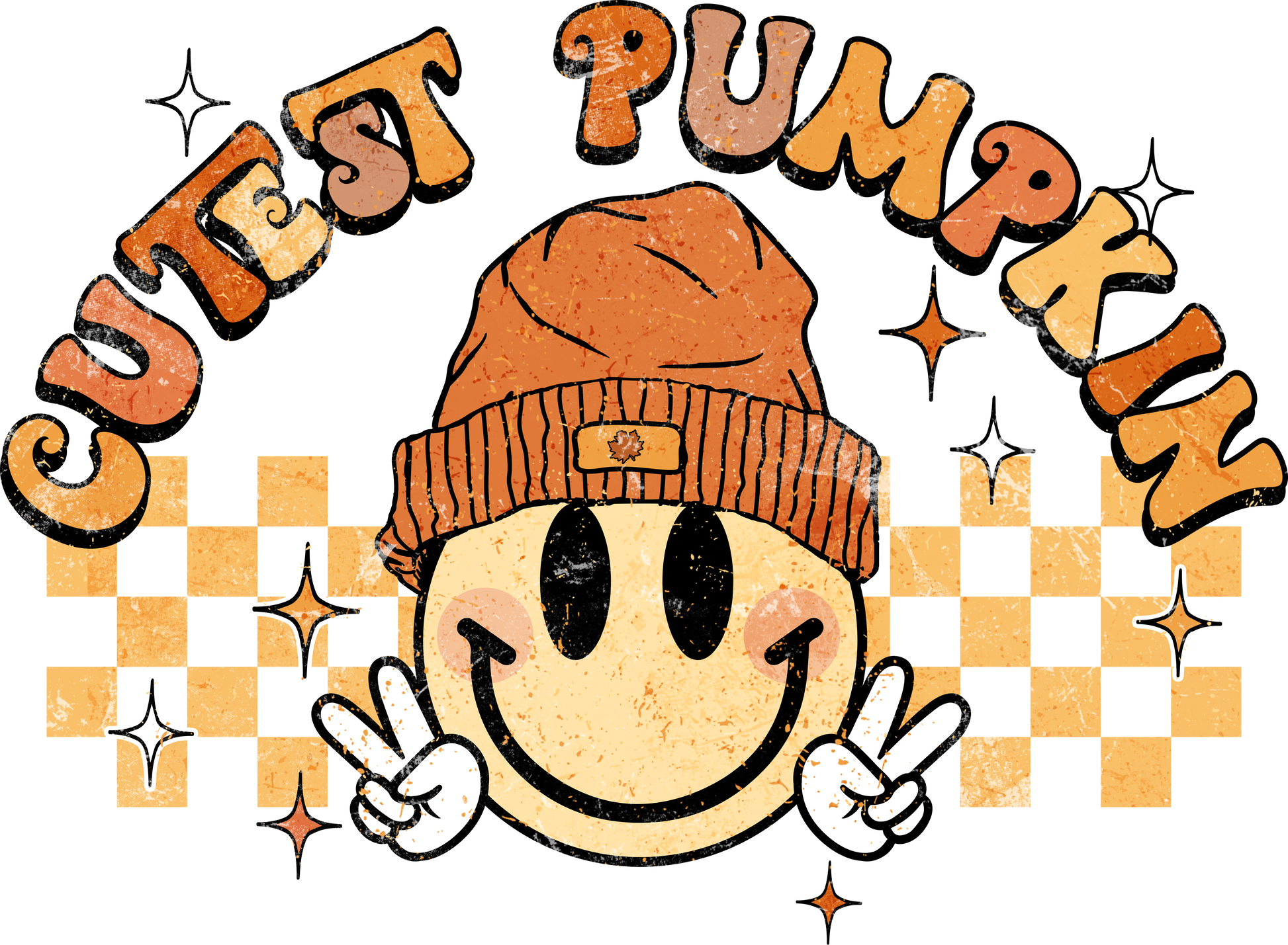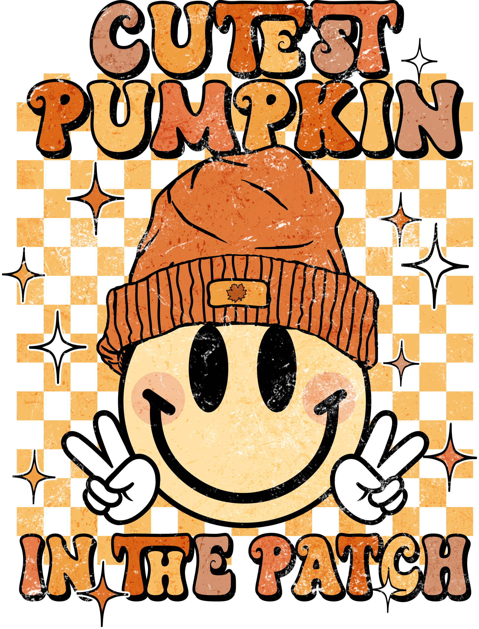 This trendy tee features a front chest print and a bold back design with a smiley face in a cozy beanie flashing peace signs over a retro checkerboard background. The warm orange tones pop beautifully against the black tee, making it perfect for pumpkin patch outings, coffee runs, or cozy fall weekends. Soft, comfy, and full of personality — it’s the ultimate fall favorite!