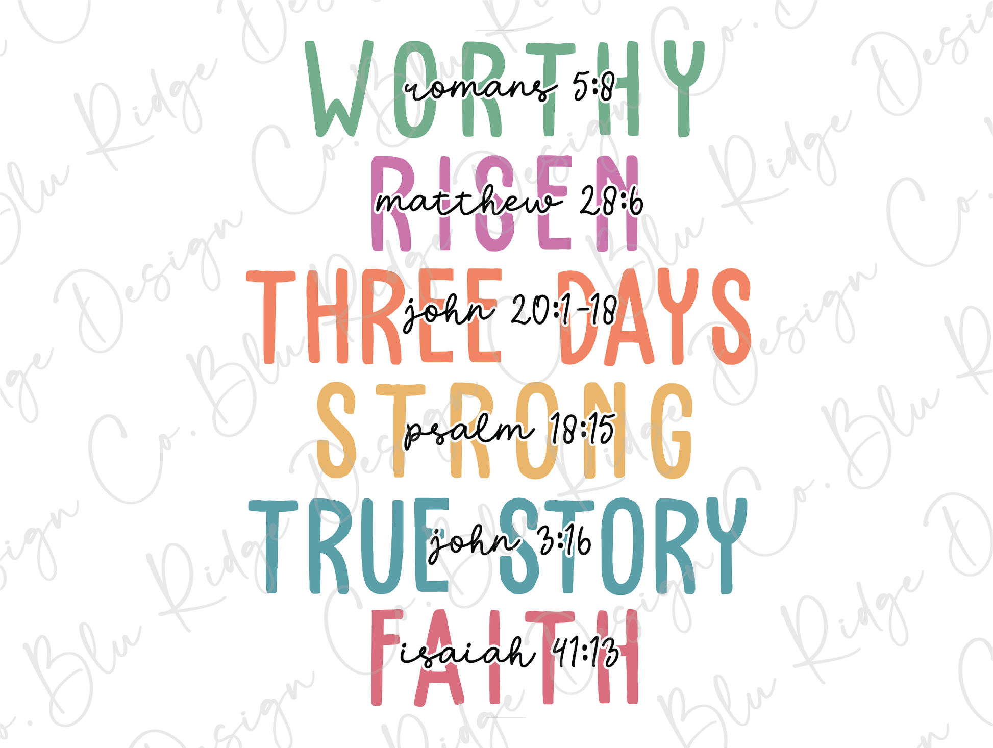 This uplifting Easter-inspired design features stacked, colorful lettering that walks through the Easter story—from worry and risen hope to a strong, true story of faith. Each line is paired with meaningful scripture references, creating a bold yet heartfelt design rooted in encouragement and belief. Perfect for Easter Sunday, church events, faith gatherings, or everyday wear, this design shares the message of resurrection and unwavering faith in a modern, approachable way.