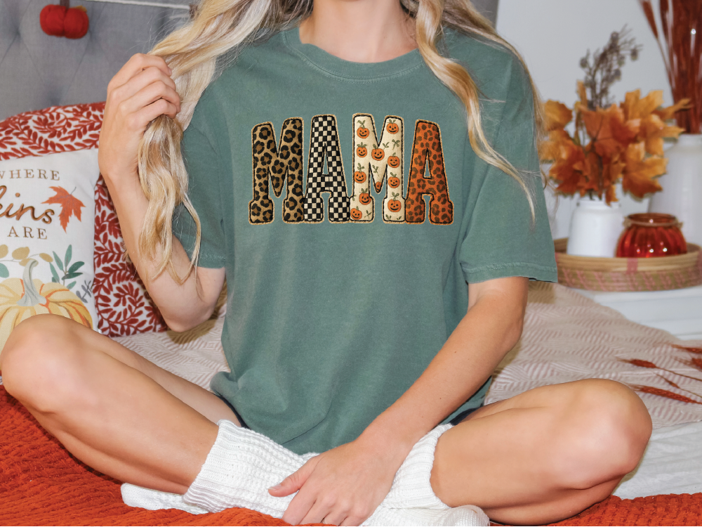 The bold “MAMA” lettering features a mix of pumpkins, checkered patterns, and leopard print—perfect for moms who love festive autumn vibes. Whether you’re heading to the pumpkin patch, sipping cider, or just enjoying a crisp fall evening, this tee adds seasonal charm to your wardrobe.