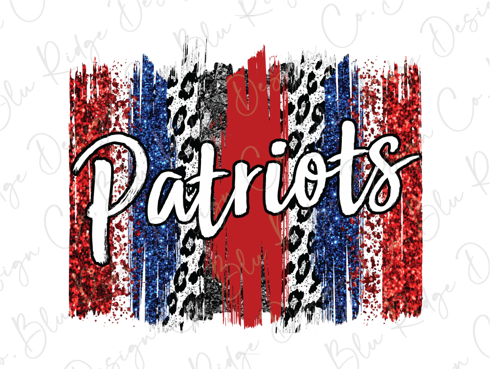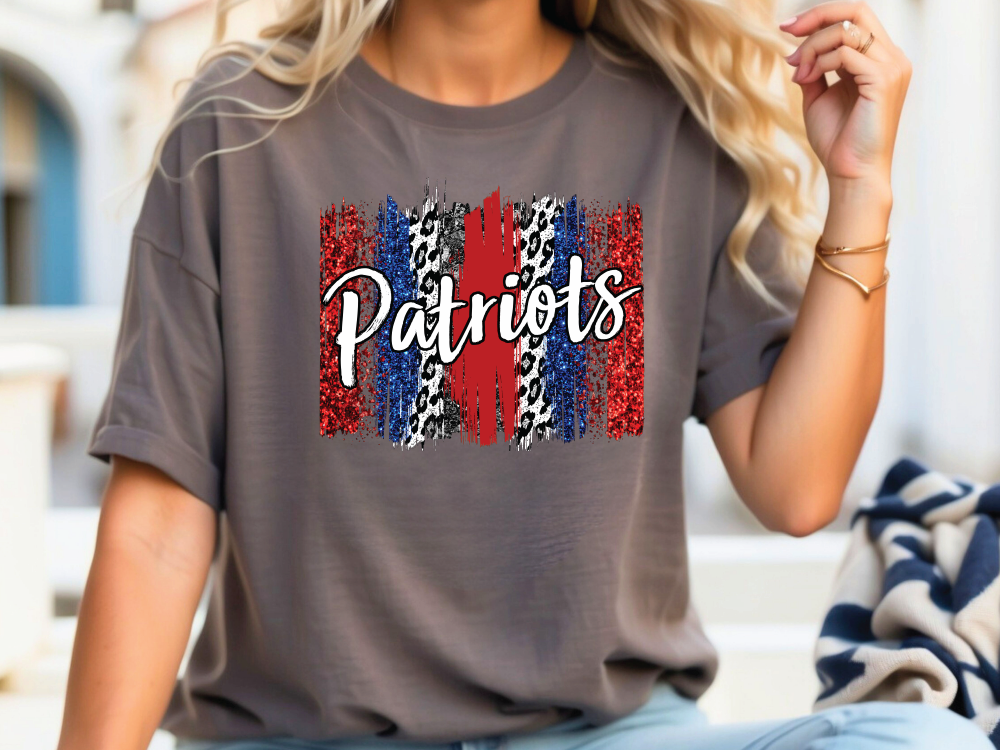 Featuring bold red, navy, and silver glitter-inspired brush strokes with leopard accents, this design makes a statement while keeping things fun and trendy. The word Patriots is written in a stylish script across the front, making it perfect for game days, pep rallies, or just showing your pride anywhere you go.