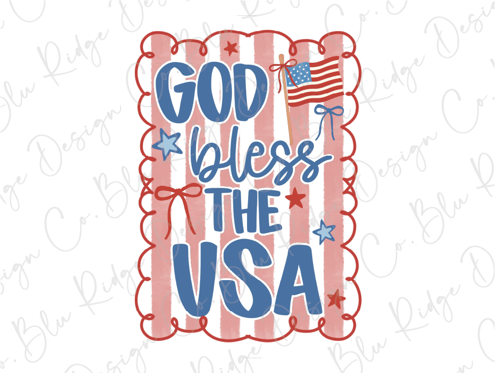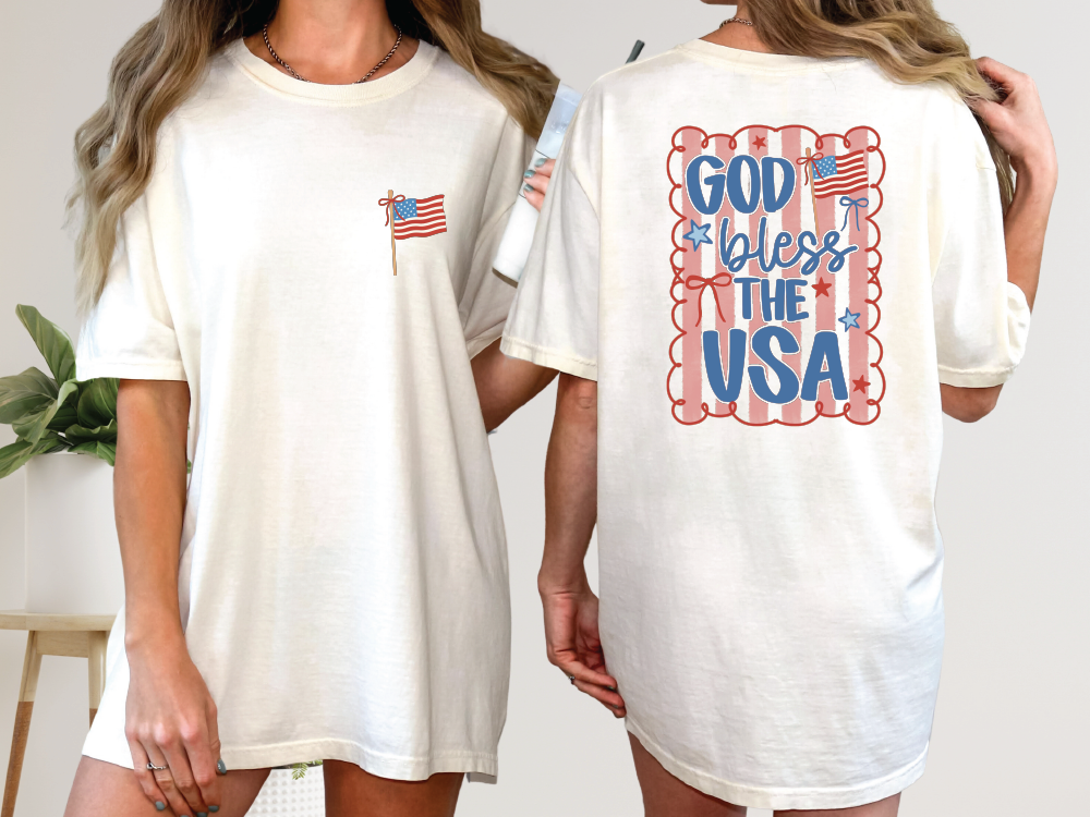This finished tee features a charming back design that reads “God Bless The USA” in hand-lettered script, framed by vintage-style stripes, stars, bows, and an American flag. The coordinating front pocket graphic showcases a mini flag tied with a bow for the perfect boutique-style touch. It’s festive without being flashy—just right for summer BBQs, fireworks, or casual patriotic style year-round.