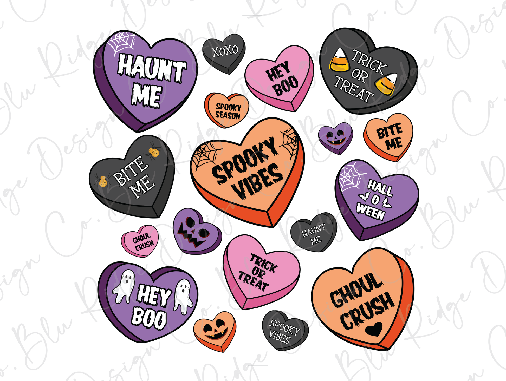 Show off your spooky-sweet side with our Halloween Candy Hearts Graphic Tee!