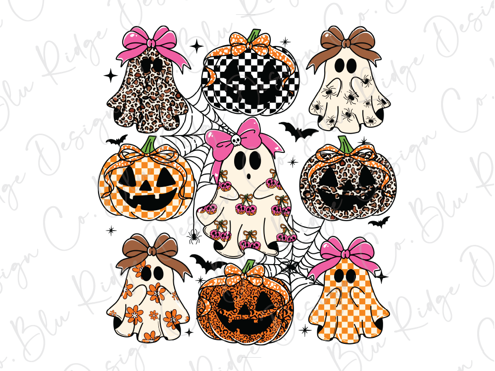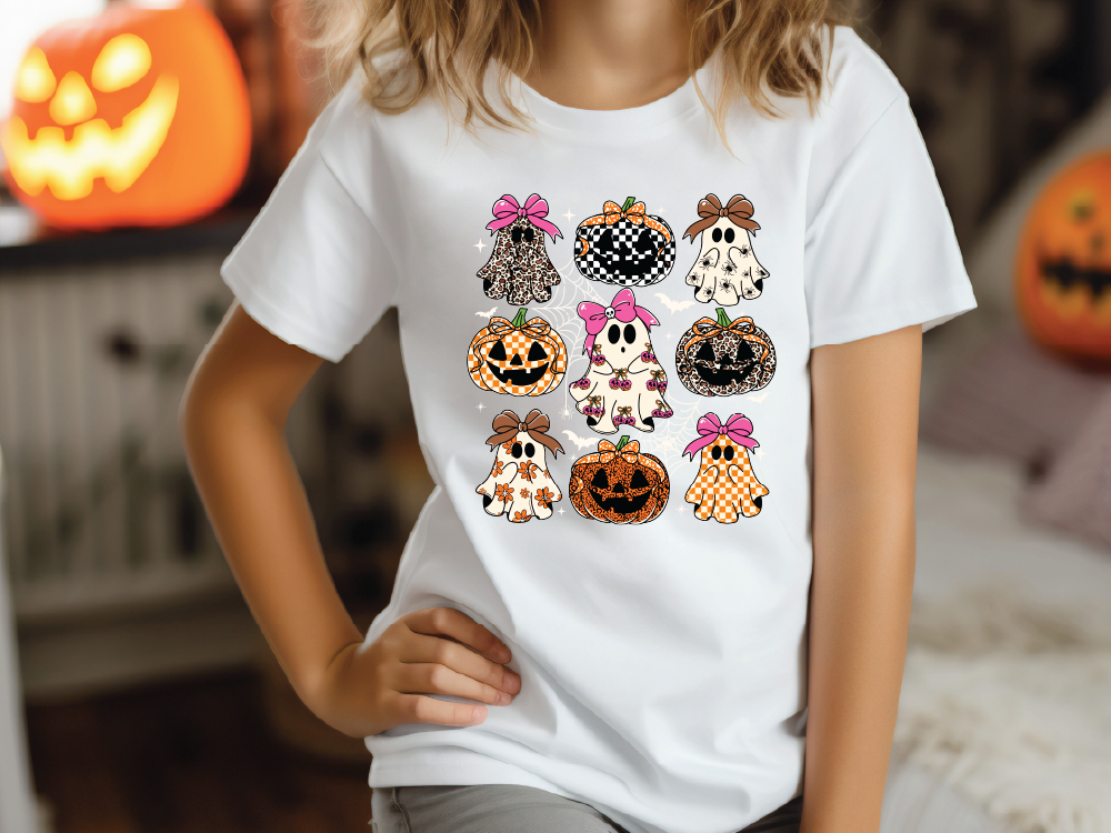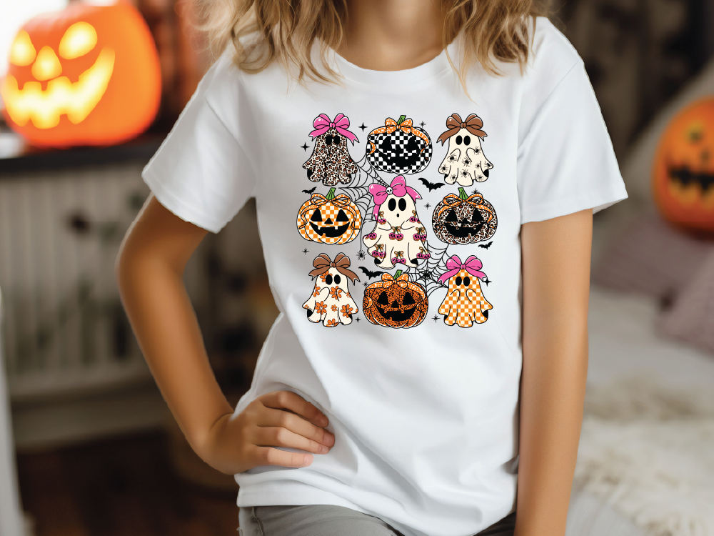 Add some spooky-cute charm to your fall wardrobe with our Girly Ghost & Pumpkin Graphic Tee!