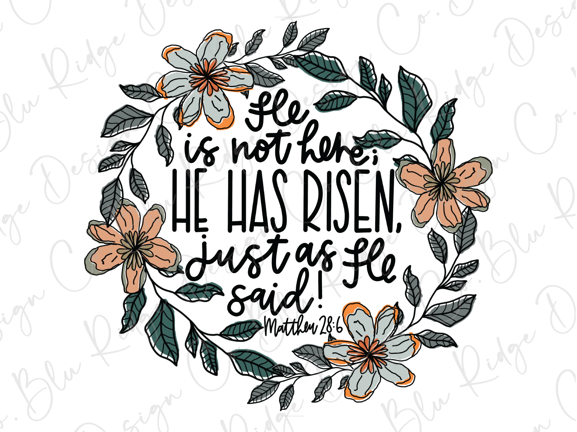 This beautiful design features a delicate wreath of hand-drawn flowers encircling the powerful scripture: “He is not here. He has risen, just as He said!” Inspired by Matthew 28:6, it celebrates the resurrection with grace, warmth, and faith-filled meaning. Perfect for Easter Sunday, church gatherings, or everyday inspiration, this design blends scripture with a soft, floral aesthetic that feels both meaningful and wearable.