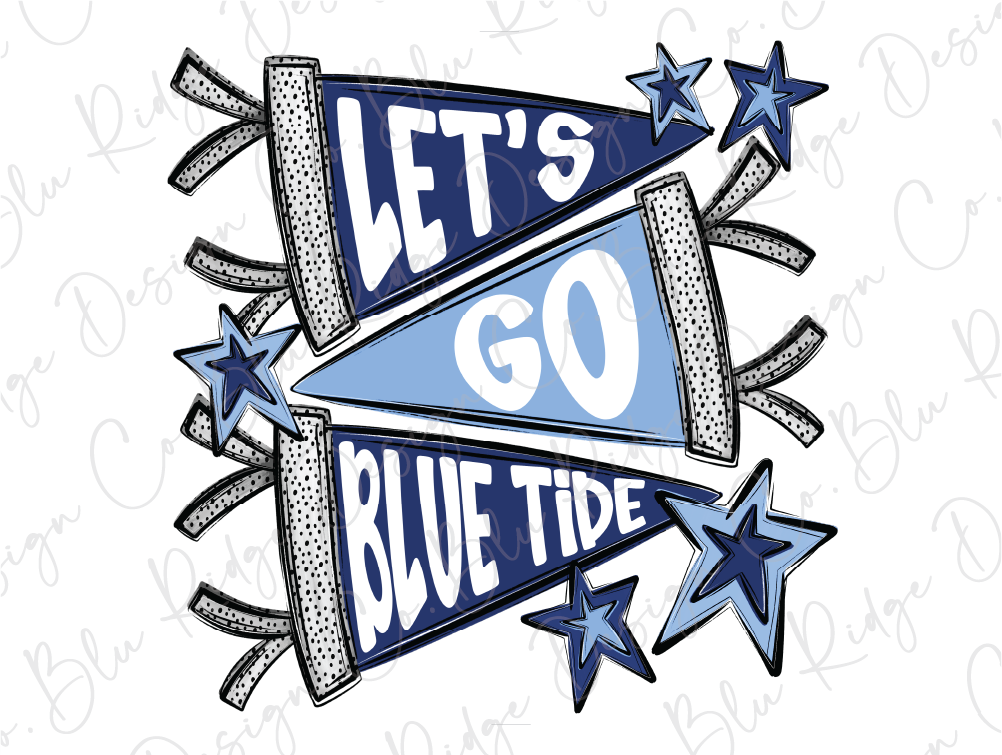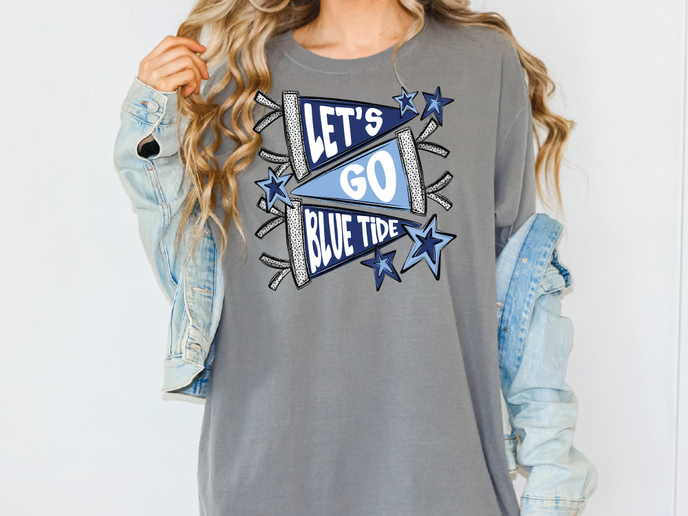 This Let’s Go Blue Tide graphic is packed with pep, featuring stacked megaphones, hand-drawn stars, and energetic lettering in layered shades of blue and white. It’s the perfect tee for supporting your team with pride—whether you're on the sidelines, in the stands, or repping your school around town.