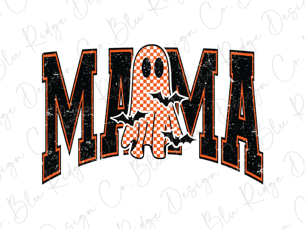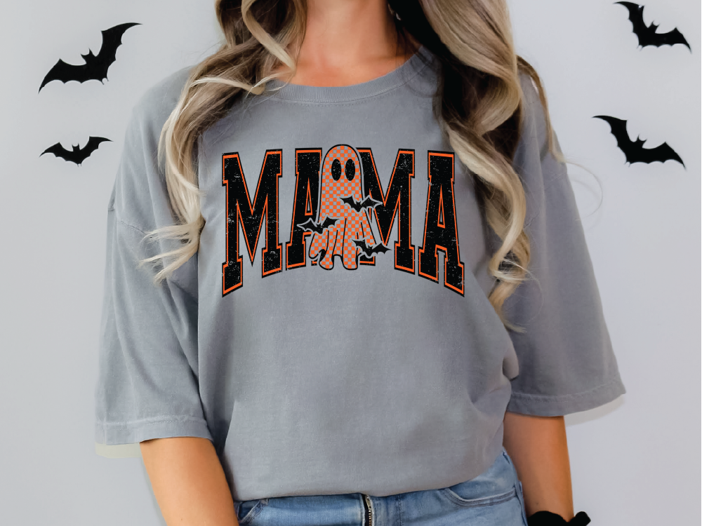 This Halloween tee features bold varsity-style “MAMA” lettering with a fun twist—a checkered orange ghost and flying bats right in the center! Perfect for fall festivals, trick-or-treating, or showing your Halloween spirit with your little monsters.