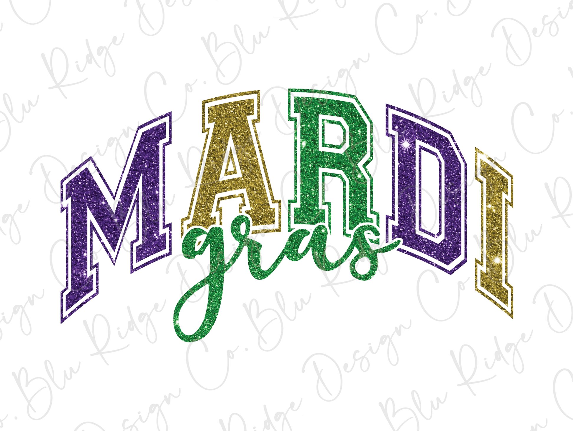 Keep it classic and festive with this bold Mardi Gras design featuring a timeless collegiate-style font accented in traditional purple, green, and gold.