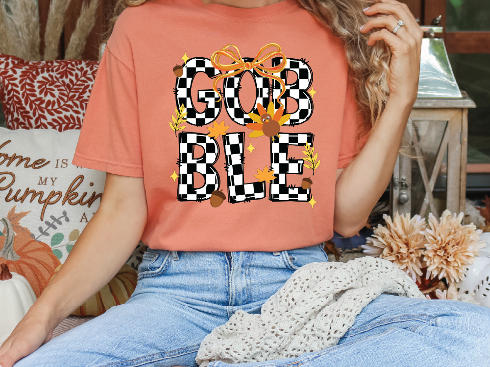 Bring the spirit of Thanksgiving to life with this playful Checkered Gobble Graphic Tee!