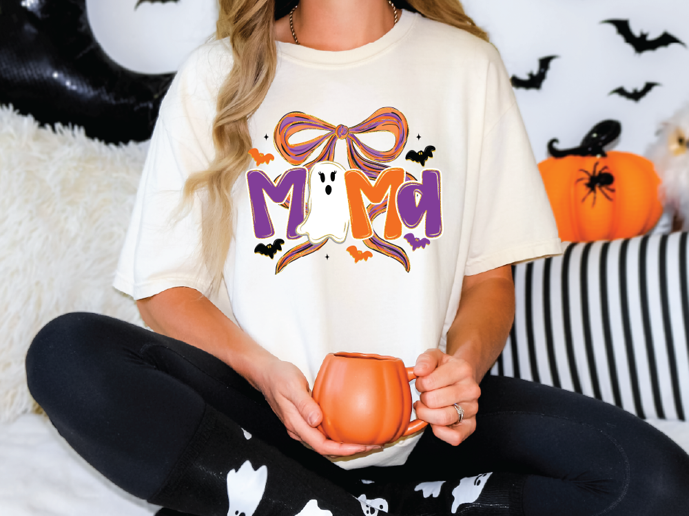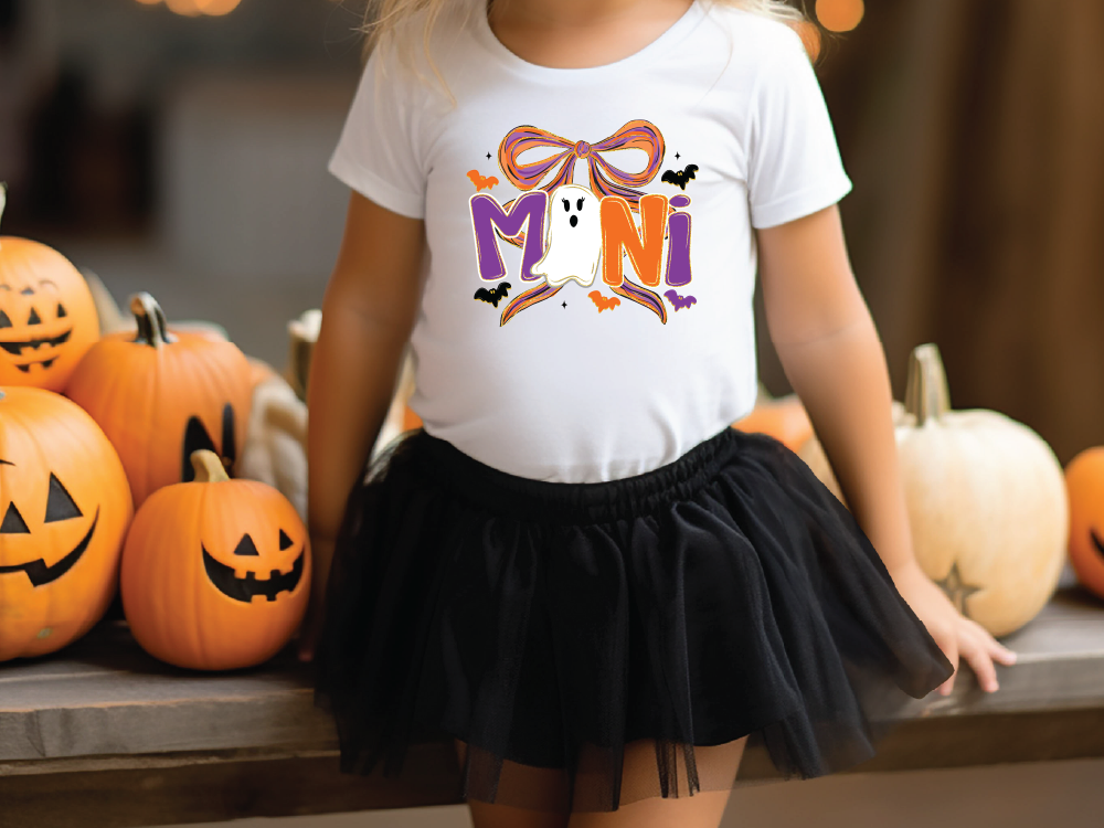 Designed for all the fun Halloween lovers  out there, this adorable graphic tee features a sweet little ghost, playful bats, and a big festive bow for the perfect mix of cute and spooky. Made with soft, comfy fabric, it’s perfect for pumpkin patch visits, trick-or-treating with the family, or cozy movie nights. A Halloween must-have for everyone who loves a little seasonal flair!