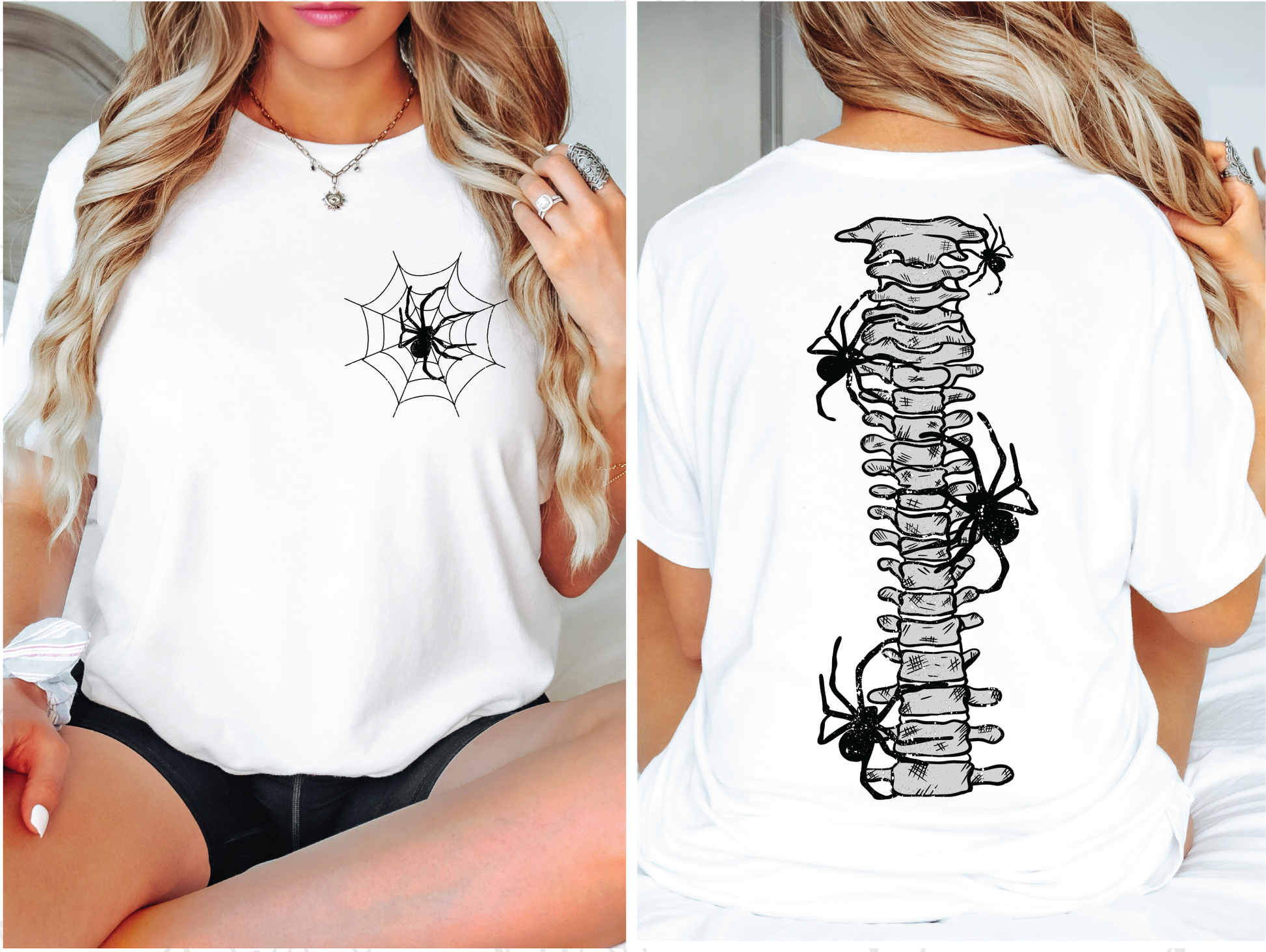 On the front, a bold spider rests in its delicate web over the heart, while the back steals the show with a detailed spine crawling with oversized spiders. The striking black ink design pops against the crisp white tee, giving it a bold Halloween vibe with just the right amount of eerie charm. Perfect for anyone who loves spooky season, creepy crawlies, or statement graphics that turn heads. 🕷️🕸️