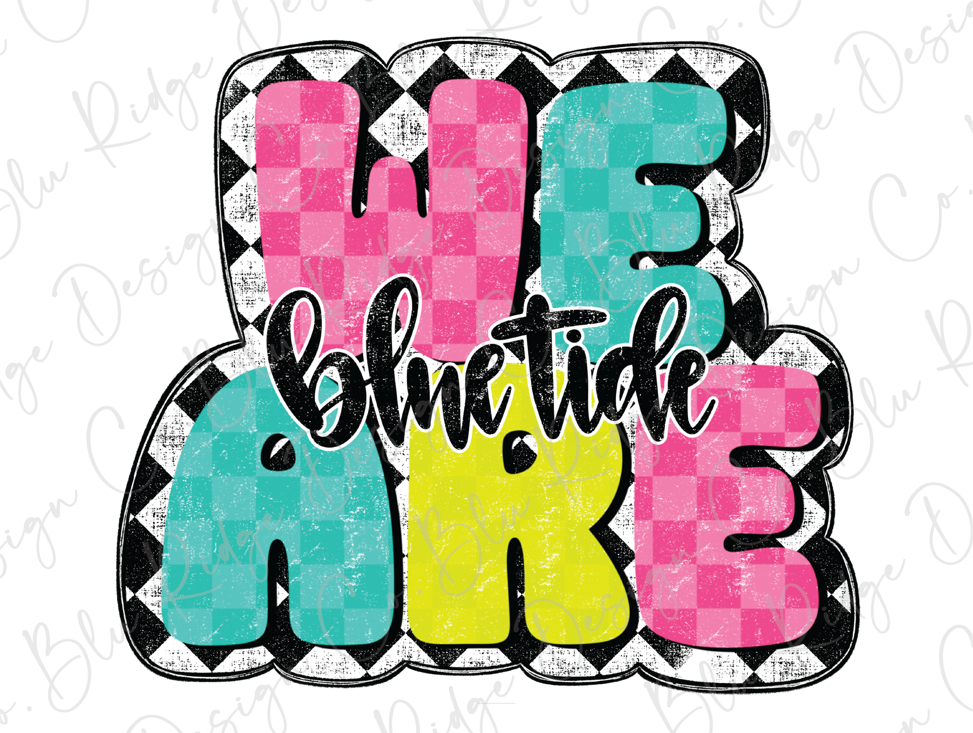 This fun design features vibrant block letters in pink, teal, green, and yellow, each filled with a playful checkered pattern that stands out. Outlined in crisp black and white for extra pop, the tee proudly reads We Are Blue Tide across the chest, making it the perfect game day, pep rally, or everyday spirit wear shirt. Whether you're in the stands, cheering from the sidelines, or just showing off your team pride, this tee is a must-have for students, parents, and fans alike.