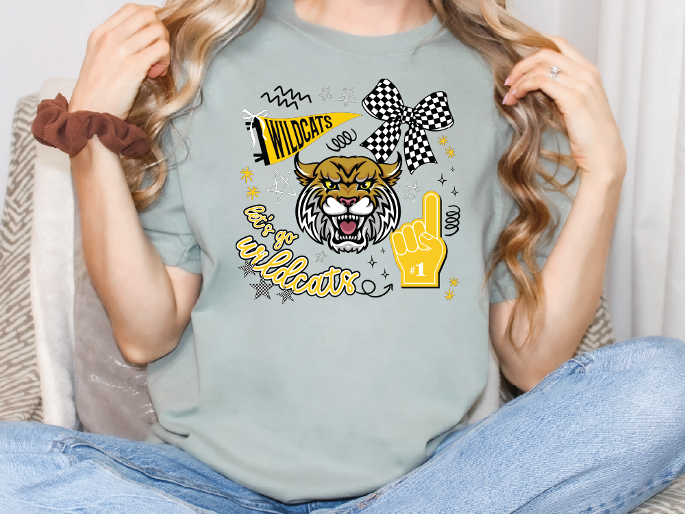 Featuring a bold wildcat graphic, checkered bow, foam finger, and fun doodles, this tee is all about school spirit. Perfect for game days, pep rallies, or showing off your everyday pride, it’s made for fans who want both comfort and style. The soft unisex fit ensures all-day wearability, while the standout gold and black design keeps your Wildcats loyalty front and center. Pair it with jeans, shorts, or spirit wear for the ultimate fan look!